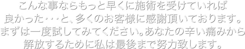 痛みを感じると他のことを何にも 考えられなくなると思います。 藁をもつかむ気持ちだと思う。 一度、騙されたと思って、来られてはいかが? 数回通って、どうなるかを実感してもらいたいと思います。