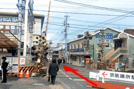 1膳所駅改札を出て、北側(琵琶湖側)出口を降りると、京阪膳所駅踏切前に出ます。